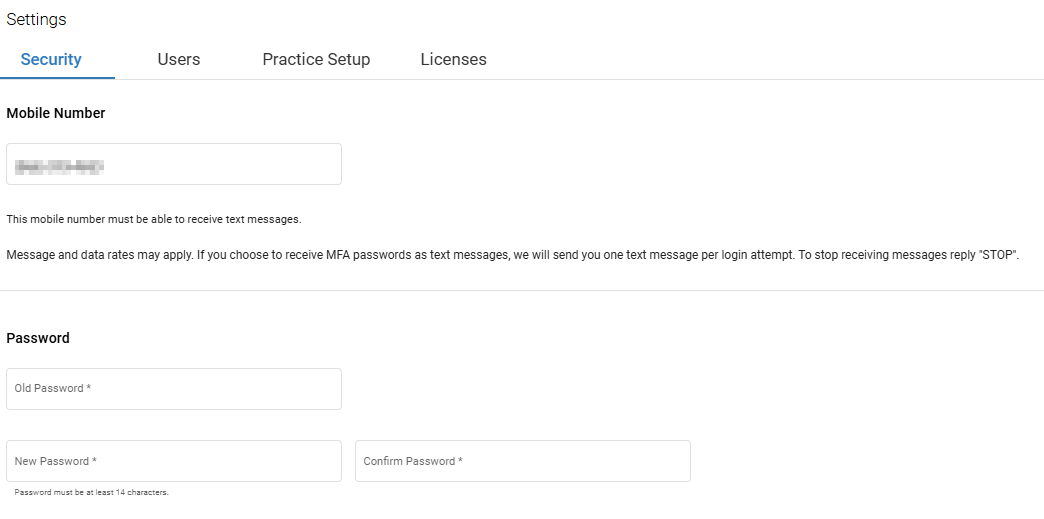 Users, Practice Setup, and Licenses settings will not display if you do not have administrator permissions.